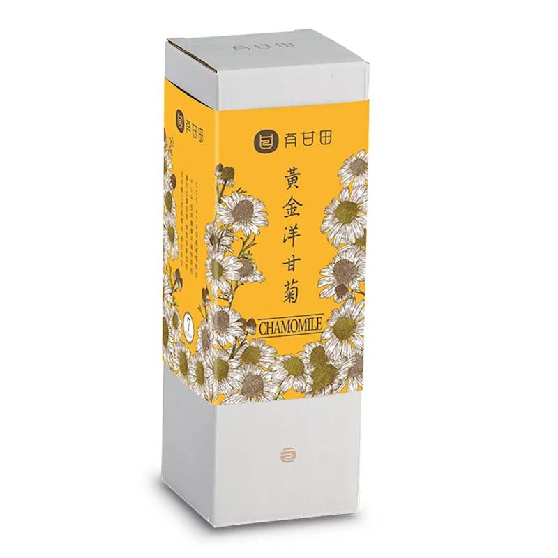 黃金洋甘菊為德國品種,特徵蕊黃瓣白,屬直立莖。根、莖、葉、花、全株均可使用,其乾燥花朵可萃取出其功效較溫潤的洋甘菊精油做為芳香療法、花草茶使用,有安神鎮定、舒緩調和思緒及幫助入眠的功效,是精油芳療氣味與放鬆紓壓功能兼俱的花草茶。茶農以純手工梳理、蹲趴於地的方式採收一分地的黃金洋甘菊,僅可獲得12公斤的乾燥花朵。在細心篩選、在多次繁複日曬與烘乾手續後,才能製成1公斤的黃金洋甘菊花茶包,產量珍貴稀少。
